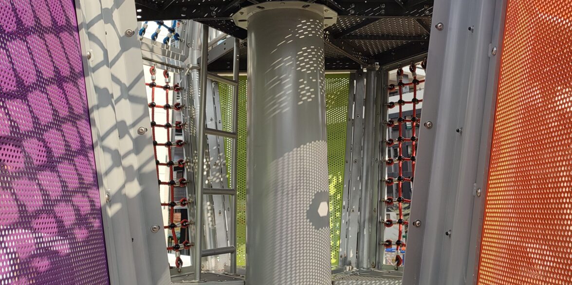 Rope cladding is designed to EN1176 and ASTM playground safety standards to ensure that there are no risks of falls. The rope cladding gives the structure a colour pop, and allows full visibility for the children up high to get a great view, and the parent down below for ease of mind.