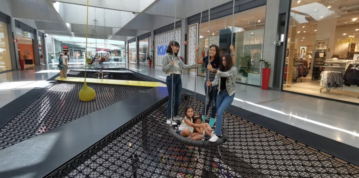 The four group hammock nets give shoppers a place to stop, play, and relax. An additional safety netting was applied to prevent any smaller items falling to floor below. After a full day of shopping, sit your bags down and lie down on the net, or if you still have energy go for a scramble!